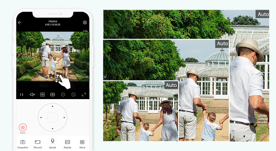 La detectarea miscarii, aceasta camera PTZ va captura si urmari automat miscarea, activand lumina stroboscopului pentru a speria intrusul cat timp va va trimite notificari pe telefonul dvs. (puteti porni de asemenea "Alarm Tone" in aplicatie pentru a activa o sirena galagioasa).