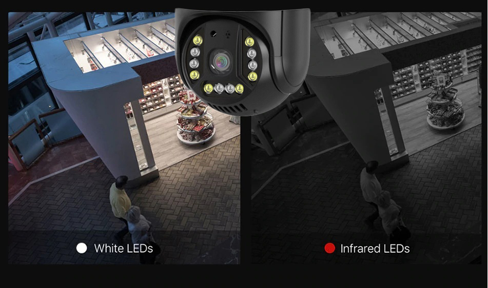 Spuneti la revedere filmarilor alb-negru pline de purici pe timp de noapte. Cu 6 LED-uri infrarosii si 6 LED-uri albe, puteti vedea pana la 100 de metri in intuneric total si puteti captura imagini in culori vibrante pana si noaptea.