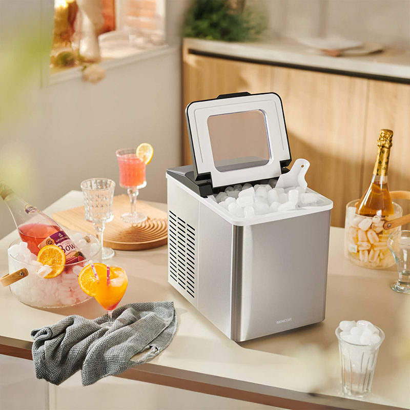 Aparat de gheață compact și elegant pentru bucătării mici, cu corp durabil din oțel inoxidabil. Adăugați doar 1,8 l de apă proaspătă, apăsați butonul și bucurați-vă de cuburi de gheață în doar 7-15 minute. Perfect pentru petreceri - produce până la 12 kg de gheață pe zi. Puteți alege dintre două dimensiuni de cuburi de gheață în formă de glonț. Funcționarea silențioasă vă prepară 9 cuburi de gheață într-un singur ciclu și le colectează în coșul de gheață de până la 500 g. Funcția de oprire automată asigură oprirea producției de gheață atunci când recipientul este plin sau recipientul de apă este gol. Monitorizează producția de gheață prin capac transparent. Lopățică pentru gheață convenabilă, ideală pentru reumplerea găleților de gheață sau depozitarea cuburilor de gheață. Ușor de utilizat cu un singur buton. Supapa de golire ajută la golirea ușoară a rezervorului de apă după terminarea preparării gheții.
