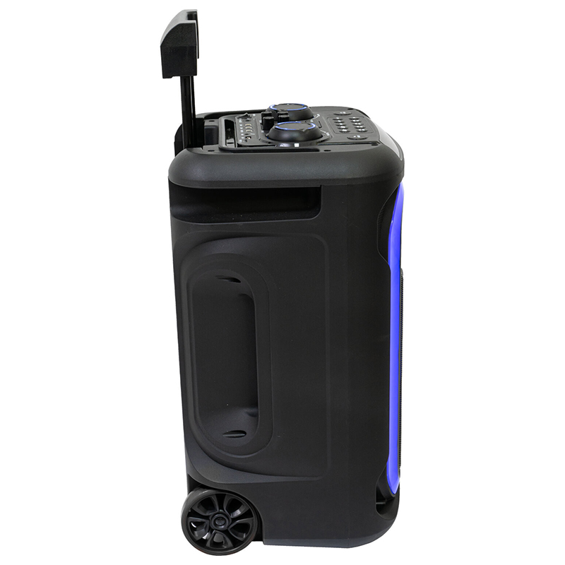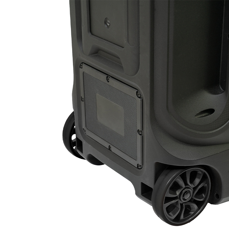 Acest difuzor mobil, prevăzut cu roți și un cărucior, este alimentat de o baterie reîncărcabilă încorporată și are un joc de lumini în față pentru a crea o atmosferă de petrecere oriunde te-ai afla.
