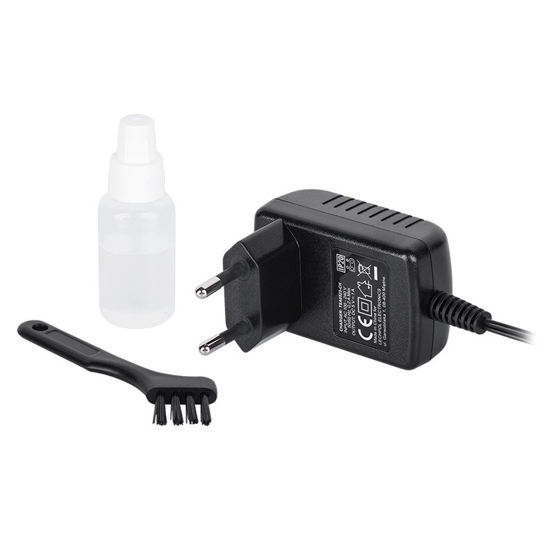 Setul include: încărcător, 4 distantiere, perie de curățare, ulei pentru întreținere, manualul de