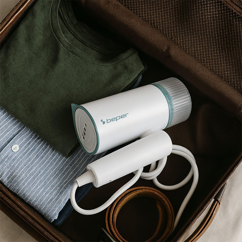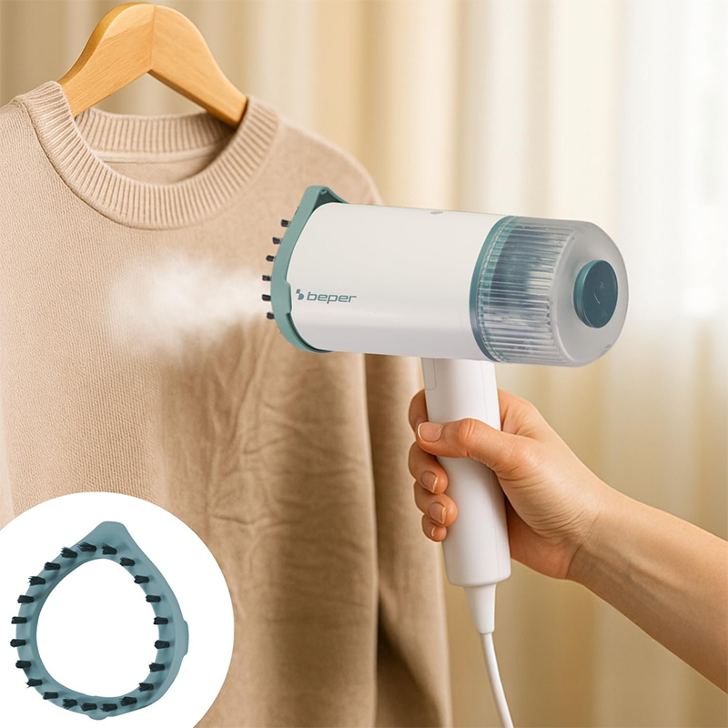 CĂLCĂ, REÎMPROSPĂTEAZĂ ȘI DEZINFECTEAZĂ: Aparatul de călcat cu abur vertical Beper îndepărtează rapid cutele, mirosurile și bacteriile de pe haine direct pe umeraș, fără a fi nevoie de fier clasic de călcat
