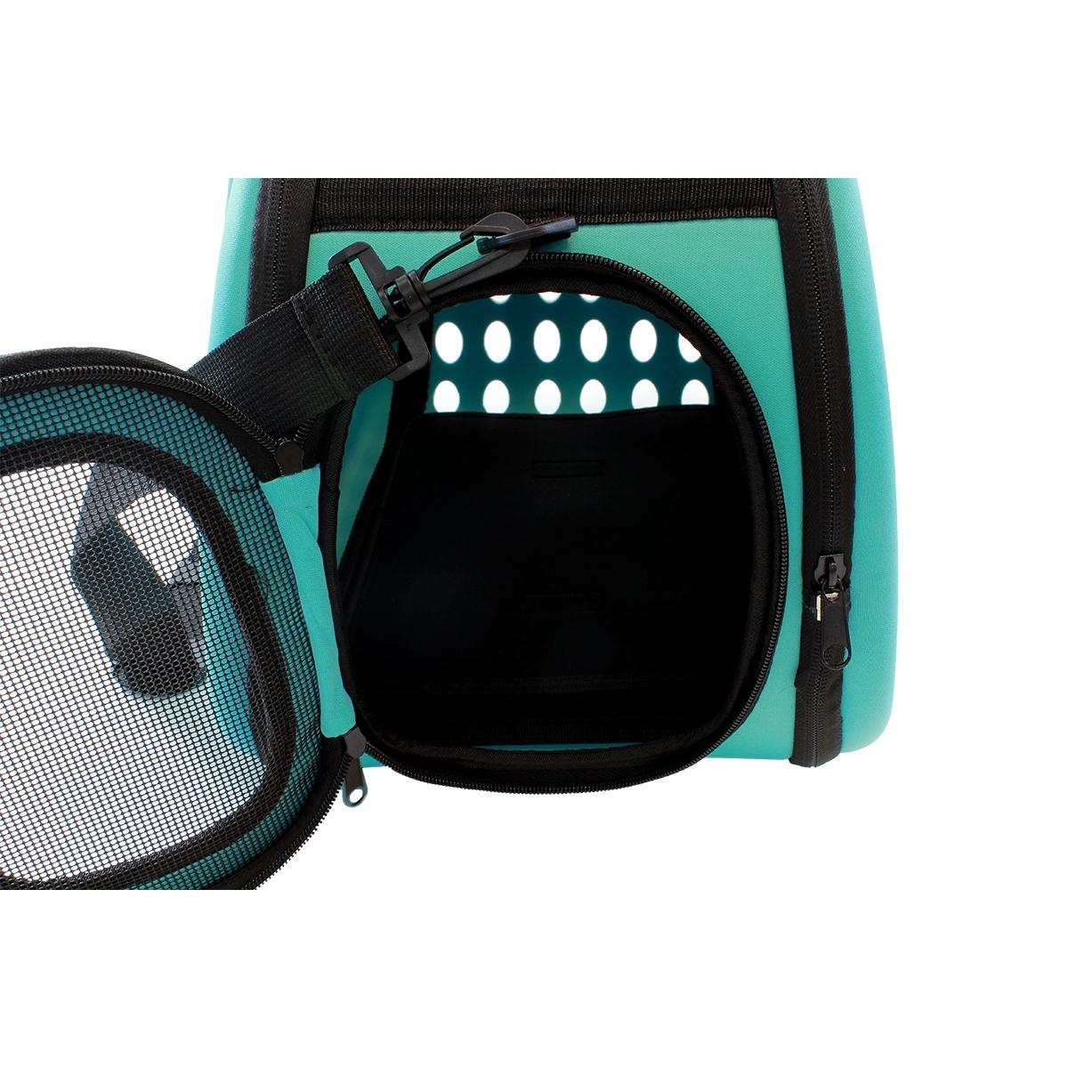 Geantă de transport de înaltă calitate pentru animalele de companie mici. Perfect pentru a ne muta pisica sau iepurele la orice distanță. Designul extrem de confortabil va asigura confortul atât pentru noi, cât și pentru animal. Materialul puternic din care au fost confecționate transportoarele, un mâner solid și o curea de umăr reglabilă asigură o utilizare lungă și fără probleme a produsului. Geanta este respirabilă și sigură pentru animalul nostru de companie datorită sistemului de ventilație. Confortul de utilizare este, de asemenea, asigurat de un fermoar dublu pe ambele părți ale suportului.