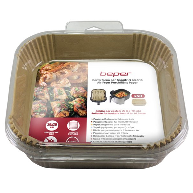 Set de 50 de tăvi din hârtie de cuptor, ideale pentru friteuze cu aer cald de la 5 la 10 litri.