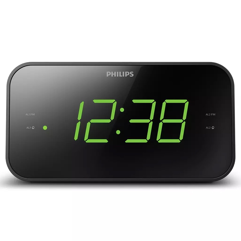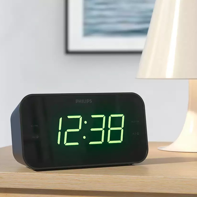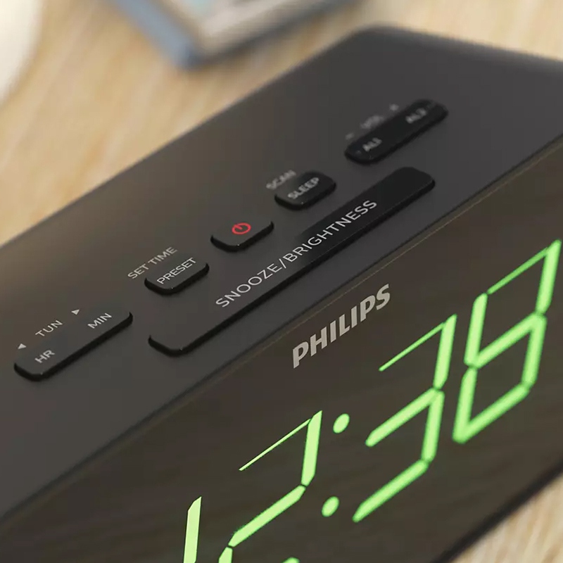 Află ora dintr-o privire cu acest radio cu ceas FM cu alarmă. Având cifre mari, afişajul este uşor de văzut din orice unghi, iar luminozitatea poate fi reglată în funcţie de încăpere. Comenzile simple permit setarea alarmei, volumului şi acordului