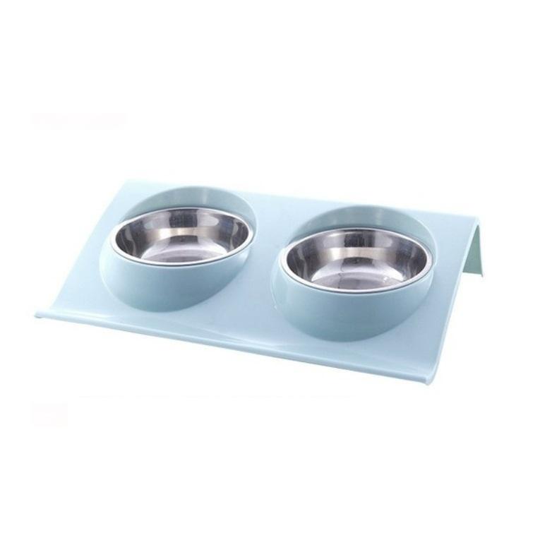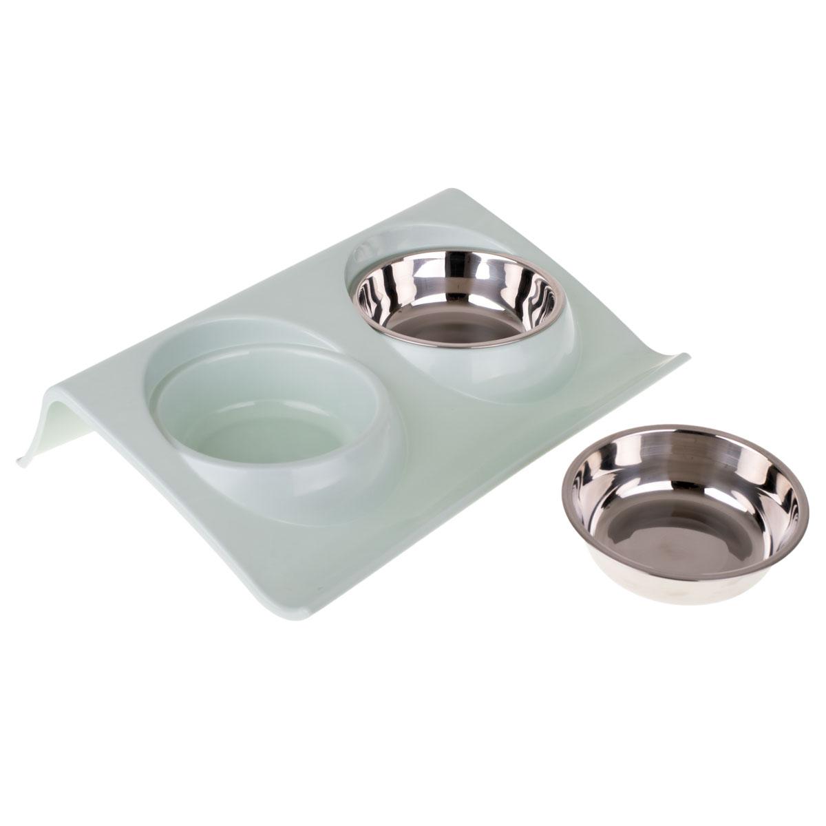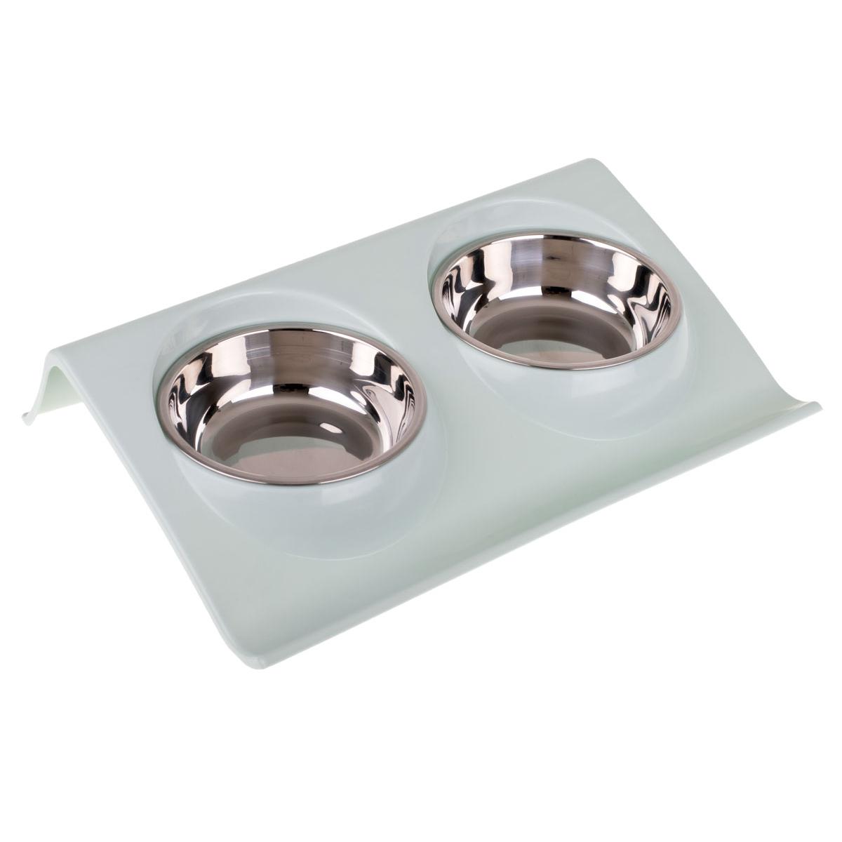 Două boluri pe o bază din plastic sunt un echipament elegant și funcțional pentru un apartament cu animale de companie.
