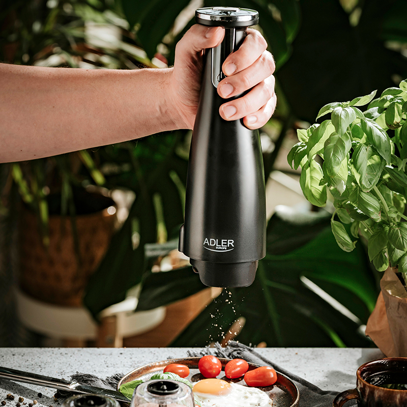 Produsul se distinge printr-o combinatie inovatoare de trei rasnite din set. Rasnita electrica AD 4449 este extrem de comoda si usor de utilizat. Are si cateva caracteristici interesante. De exemplu, puteti regla in mod liber finetea de macinare a condimentelor. Acest lucru este util daca unui membru al gospodariei ii place sarea macinata grosier, iar altuia prefera piperul macinat fin. La randul sau, baza iluminata face mai usor de controlat unde merg condimentele si cat mai trebuie macinat.
