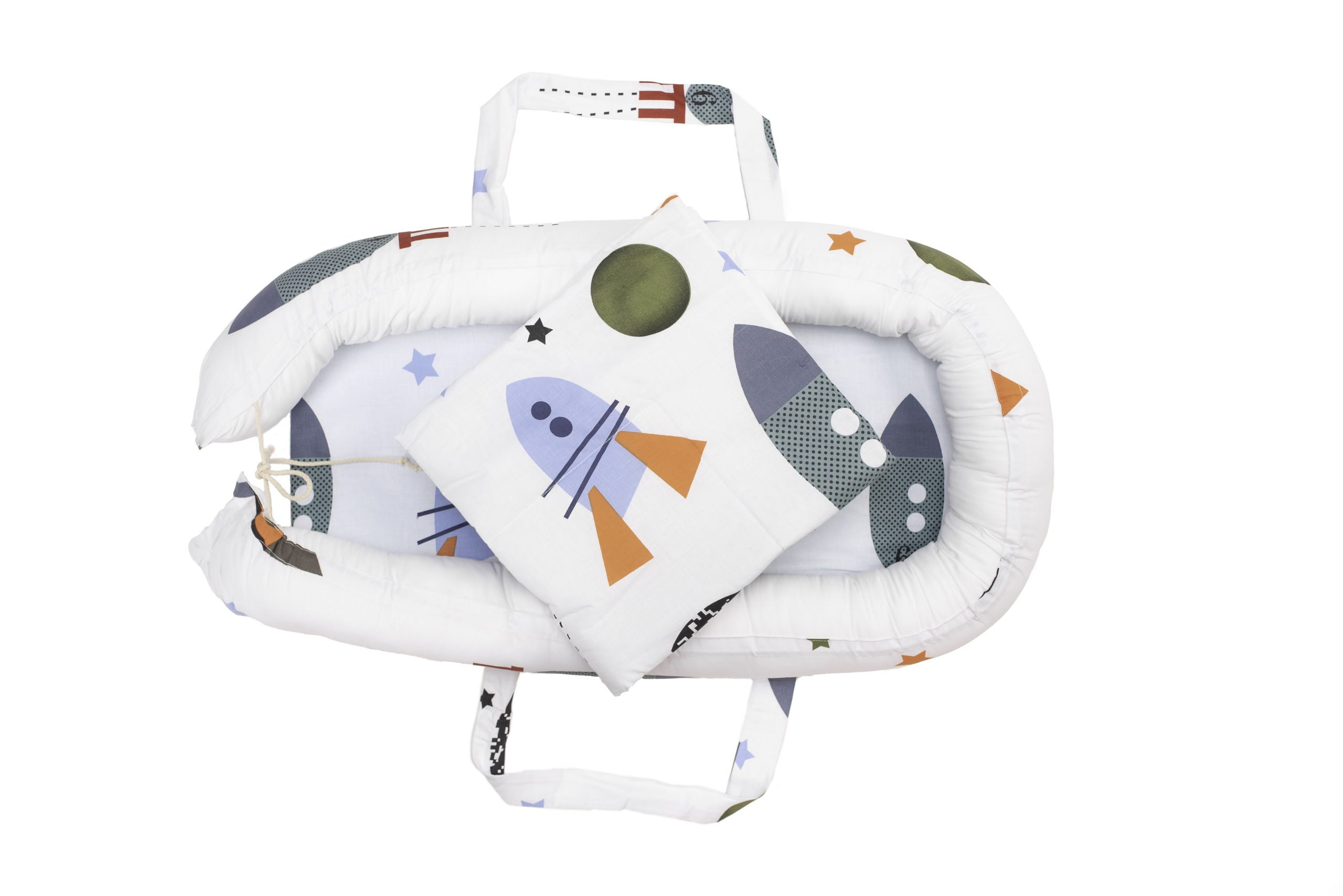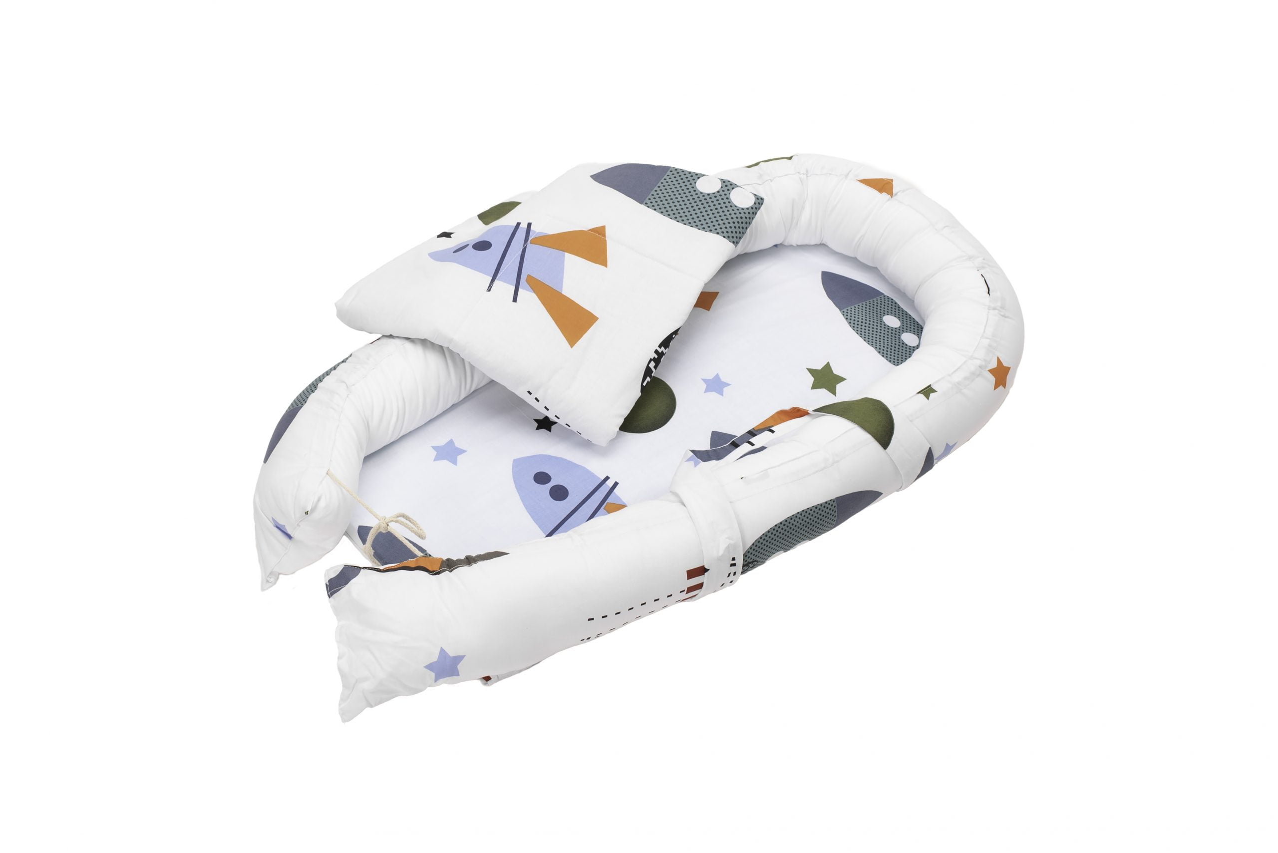 Set Baby Nest Somnart Cosulet bebelusi + Salteluta 42x84x2cm + Paturica 70x70cm, model Rachete