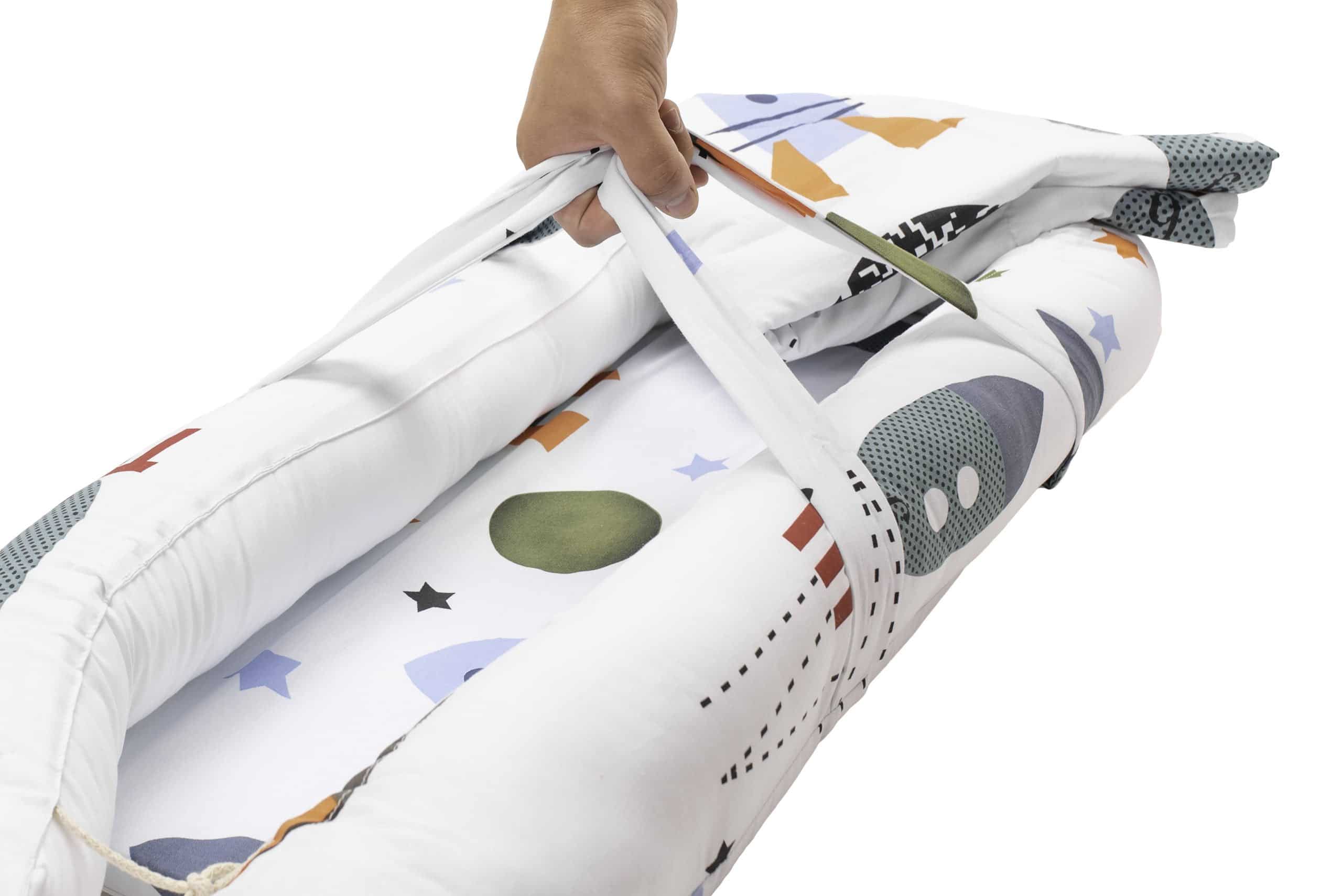 Cuib pentru bebelusi multifunctional, realizat din bumbac colorat 100%.