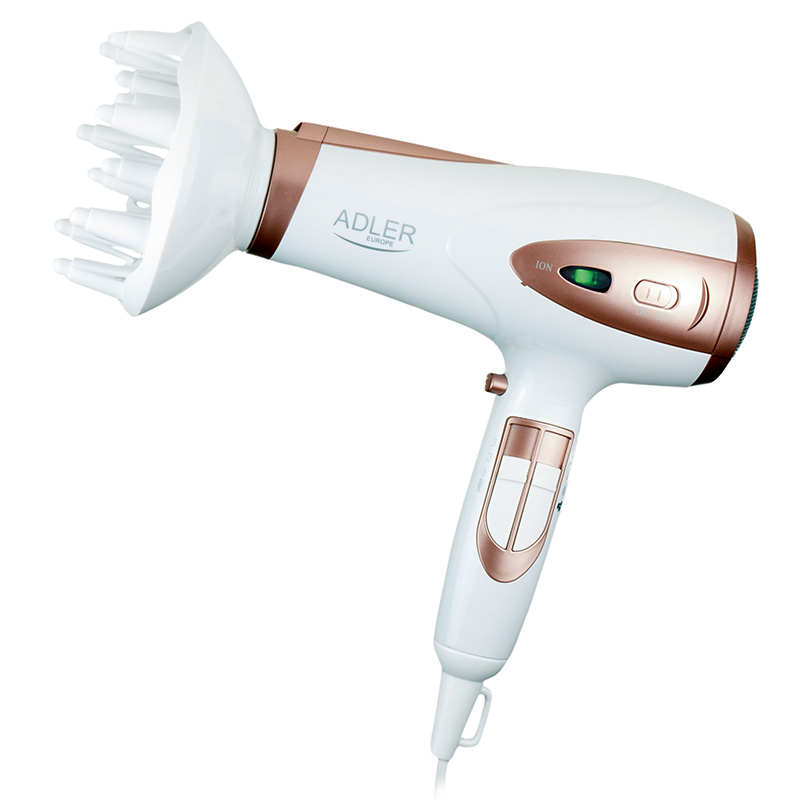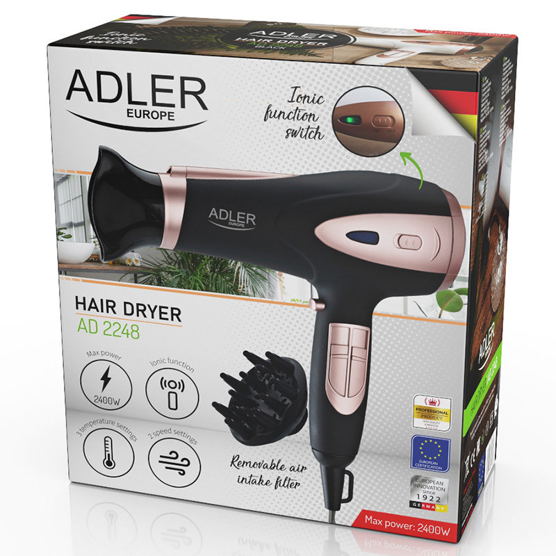Uscatorul AD 2248 cu ionizator * este o alegere perfecta pentru persoanele extrem de pretentioase carora le pasa de parul lor si de aspectul sau frumos. Uscătorul a fost echipat cu un comutator ION cu o lampă de control (când s-a pornit ionizarea, culoarea albastră se transformă în verde). În plus, uscătorul are o reglare independentă atât a vitezei aerului, cât și a nivelului de temperatură, inclusiv butonul Cold Shoot pentru fixarea finală a coafurii. Uscătorul are un filtru detașabil de admisie a aerului. Setul include un concentrator și un difuzor. Design modern.